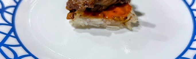 Spread all squares evenly with the Bibimbap mayo and then cut into bite size pieces. Place a little heap of bulgogi beef on each rice square and top the beef with a couple sticks of pickled apple. Refrigerate until ready to serve or eat immediately!